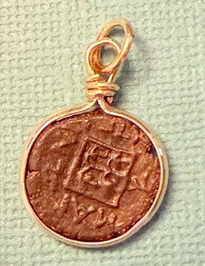 This bronze coin is surrounded by a gold-filled bezel and is 1/2" in diameter and was struck in Thrace in the 400-350 BC time frame.